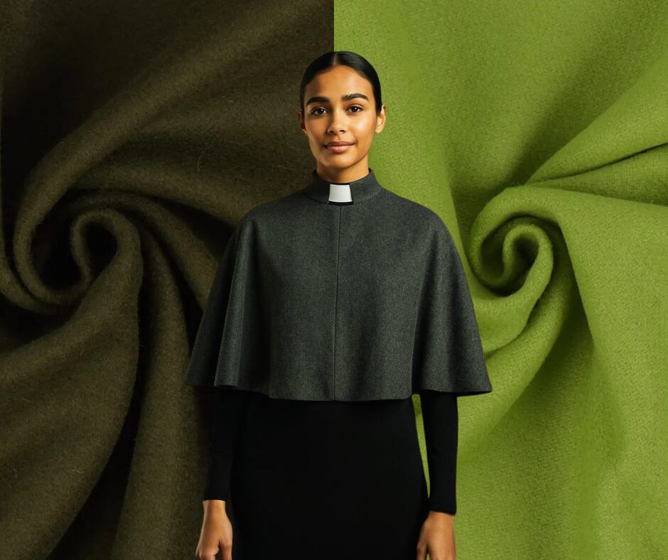 En elegant diakonponcho i 100 % ull, svensktillverkad på beställning. Skapad för funktion, värme och ett värdigt uttryck i diakonens tjänst. Ponchon är fodrad och har plats för instickskrage på ena sidan och dragkedja på andra för flexibel användning.